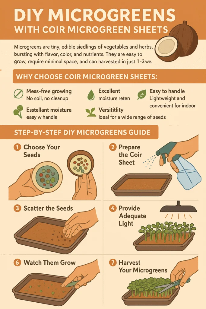 Microgreens are tiny, edible seedlings of vegetables and herbs, bursting with flavor, color, and nutrients. They are easy to grow, require minimal space, and can be harvested in just 1–2 weeks, making them -perfect for home gardening enthusiasts, kids, and urban gardeners. Using coir microgreen sheets makes growing these little greens cleaner, faster, and more sustainable than traditional soil methods.