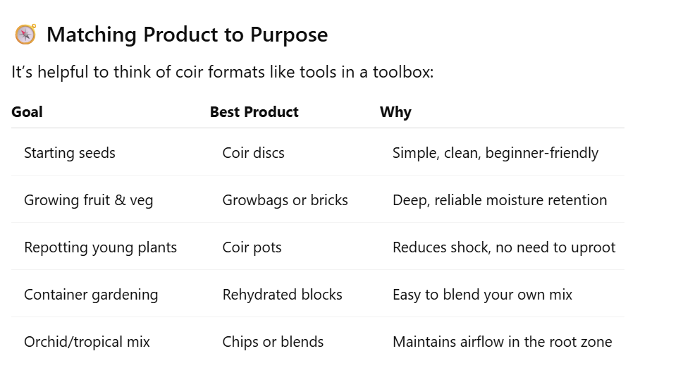 Coir comes in a range of formats — not because it’s complicated, but because gardening is diverse. The plant you grow, the space you have, and your goals (e.g., starting seeds vs maintaining a large planter) all determine which coir product works best.